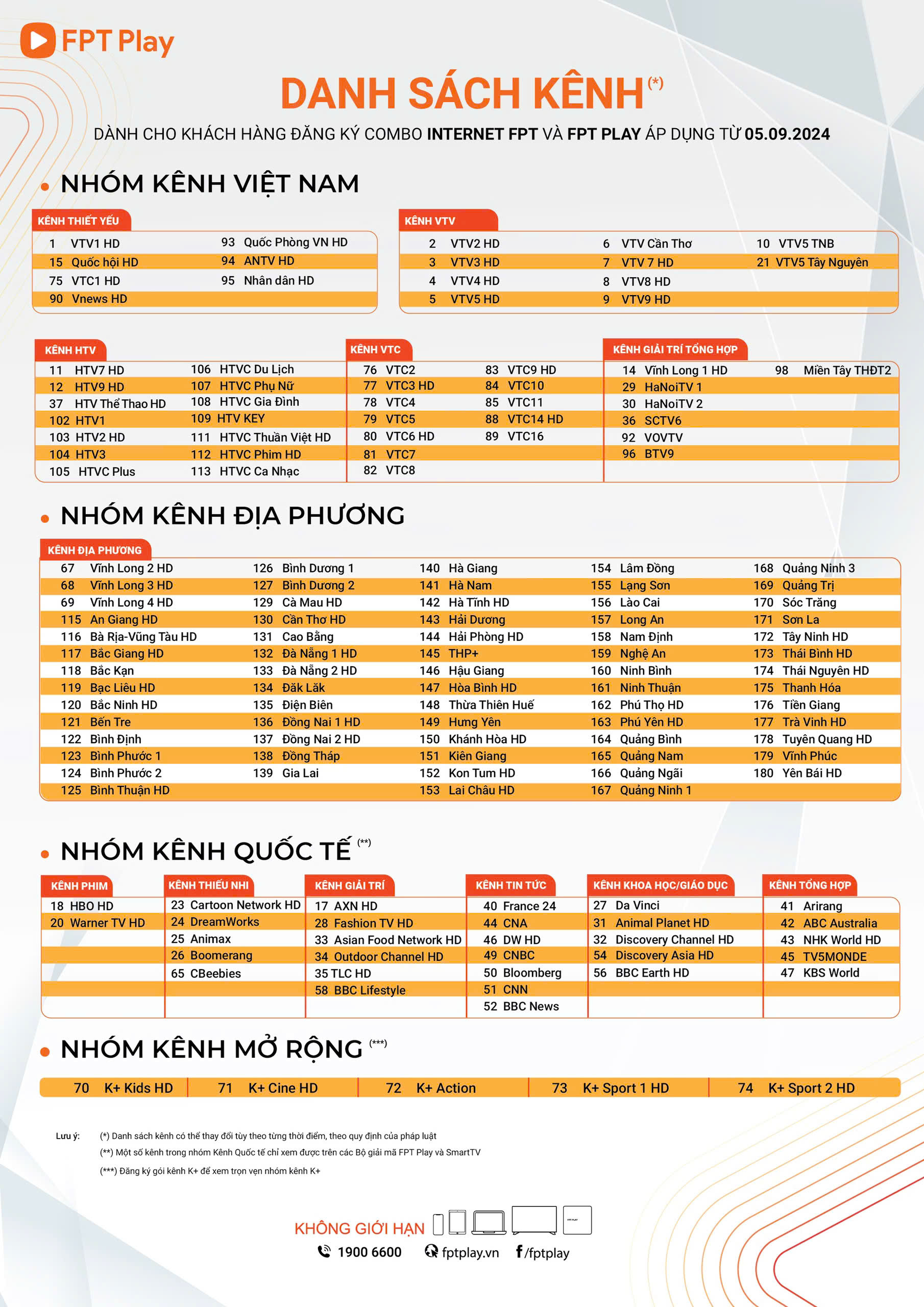 Gần 200 kênh truyền hình: Bao gồm các kênh trong nước và quốc tế đặc sắc (HBO, Cinemax, Cartoon Network…).